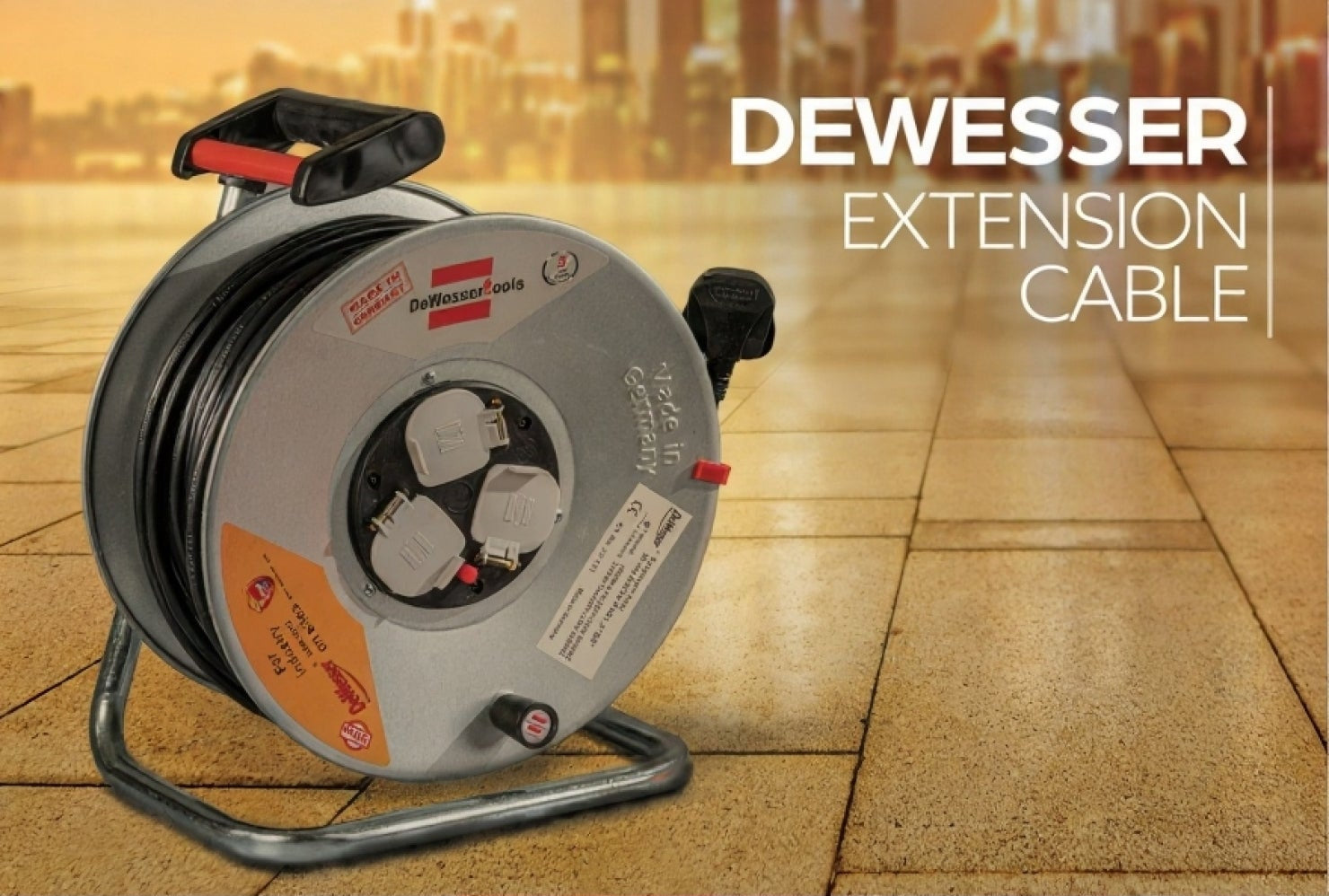 An Extension Cable by Dewesser provides extra reach for electrical tools. It ensures reliable power delivery over longer distances, featuring a durable, high-quality cable and varying lengths